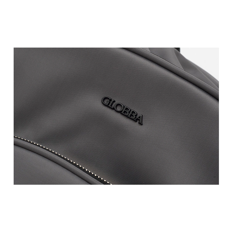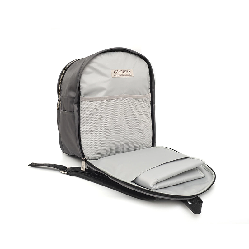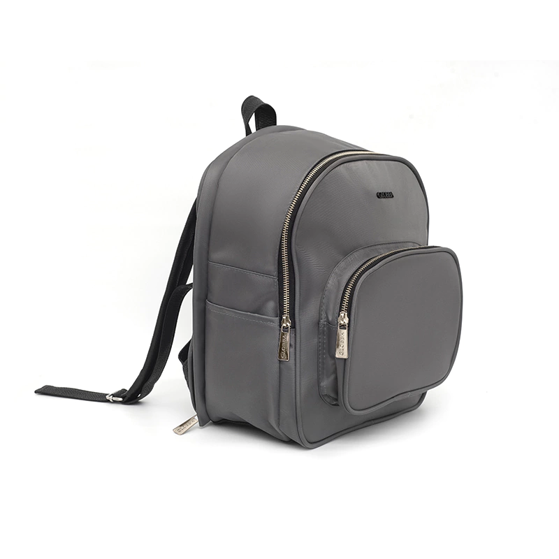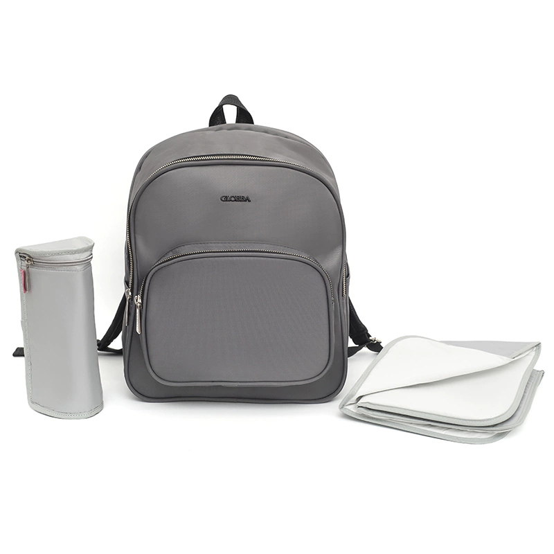 Mochila Maternal Pixie Gris confeccionada en tela impermeable con detalles en cuero ecológico negro.