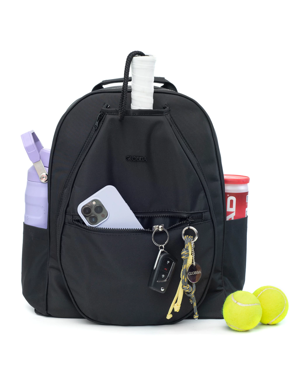 En los laterales, dos bolsillos amplios te permiten llevar tu termo de agua y el tubo de pelotas, siempre a mano. En el interior tiene un bolsillo con cierre para ropa sucia o húmeda, ideal para después del partido.