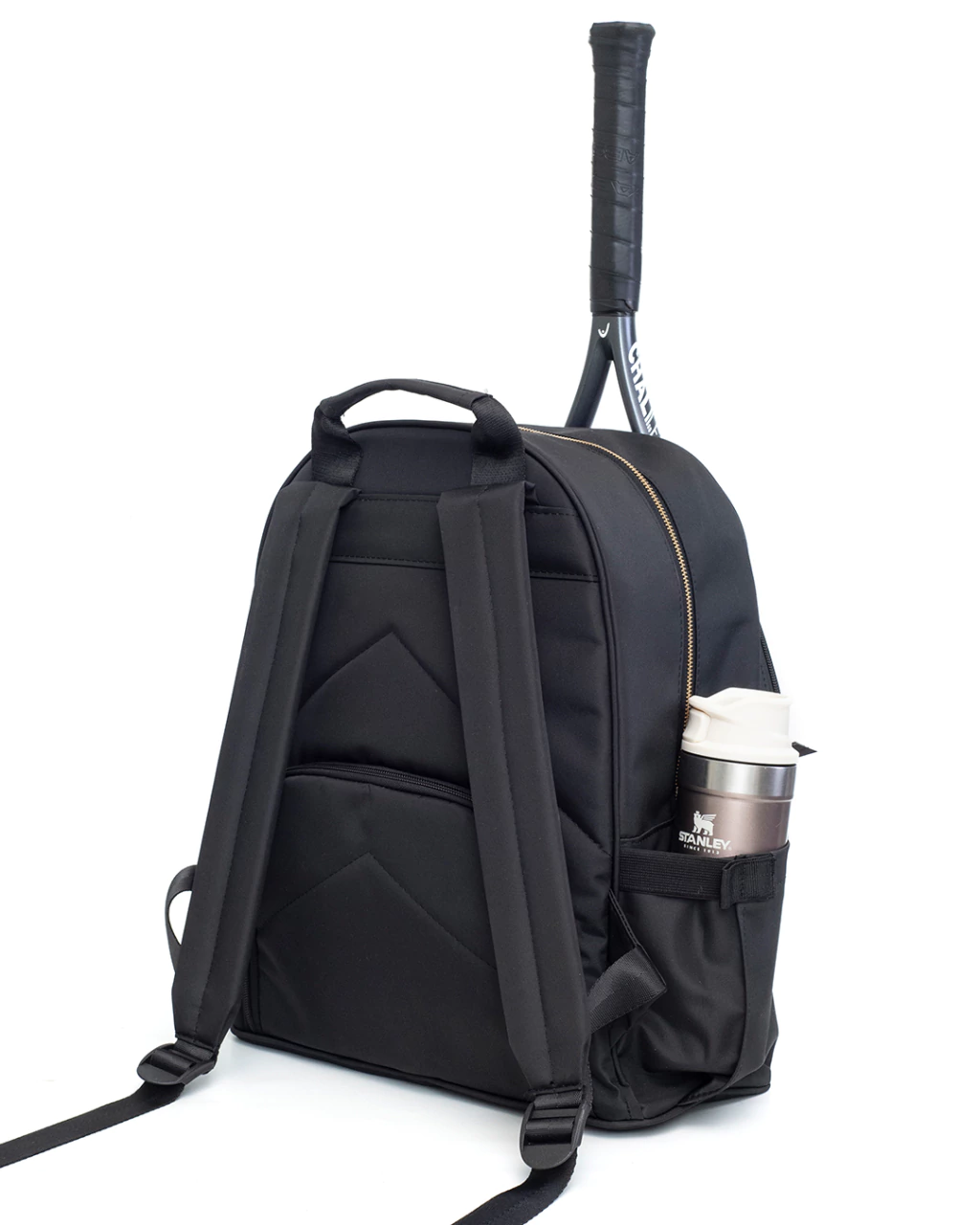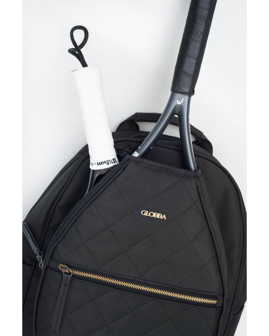 En los laterales, dos bolsillos amplios te permiten llevar tu termo de agua y el tubo de pelotas, siempre a mano. En el interior tiene un bolsillo con cierre para ropa sucia o húmeda, ideal para después del partido.